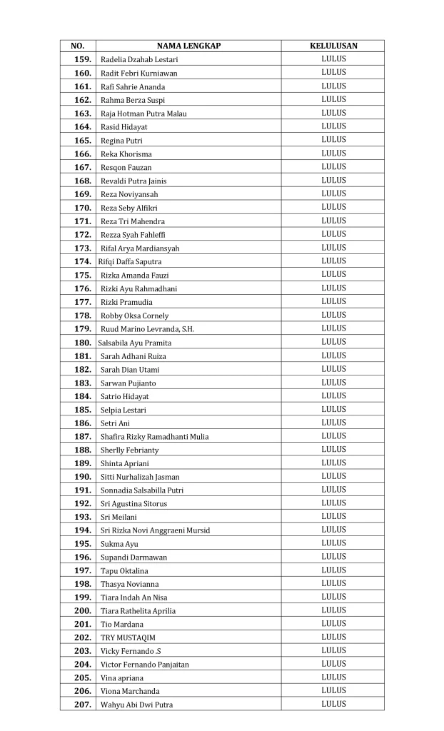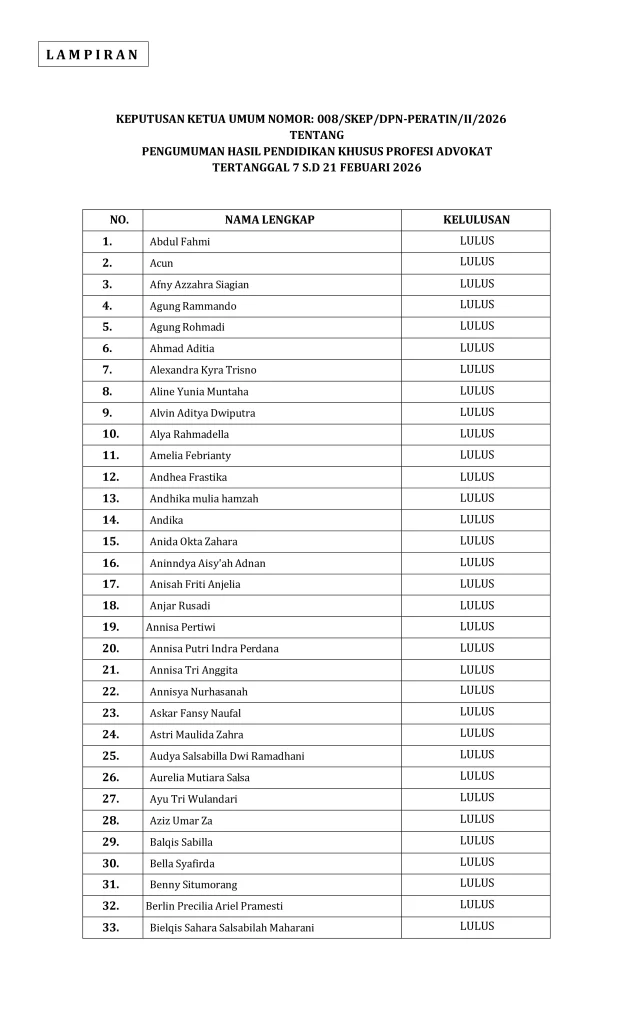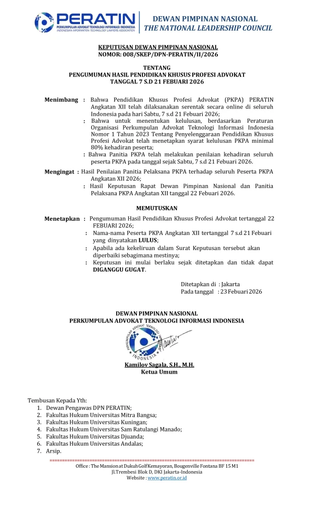 SURAT KEPUTUSAN PENGUMUMAN KELULUSAN-PESERTA PKPA ANGKATAN XII PERATIN TAHUN 2026